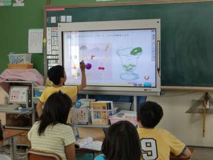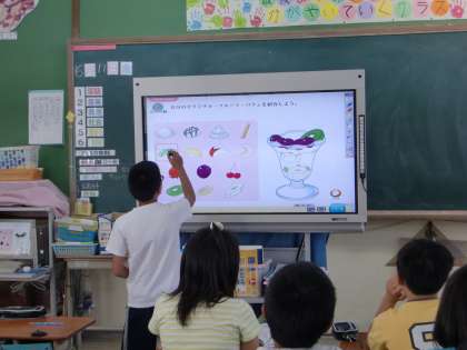 英語の時間に,電子黒板を使ってオリジナルのフルーツパフェを作りました。時間の関係で全員できなかったので,次の時間も作ろうと考えています。初めての電子黒板は,とても楽しかったようでした。