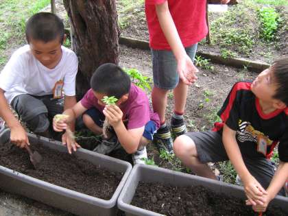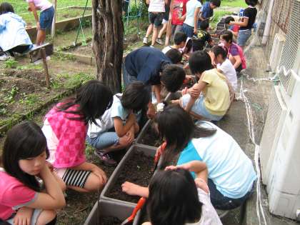 5年生の総合的な学習「MINAUZU 緑いっぱい計画!」で,緑のカーテンを作るために,プランターにアサガオ,ツルレイシを植えました。大きく育ってほしいという願いをこめながら,みんな植えていました。