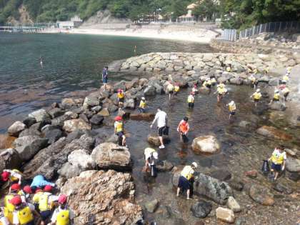 磯観察をしています。えび、小魚、貝などを見つけて大喜びです。