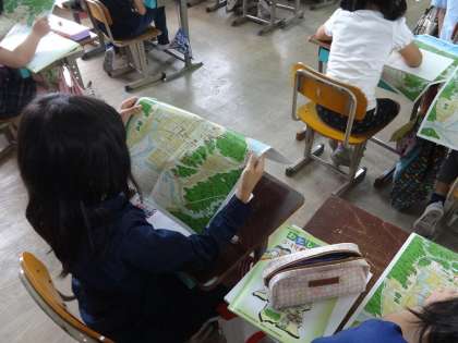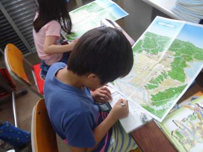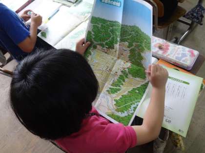 京都市の絵地図を広げて見ています。