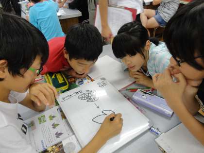 課題選択をし,グループでホワイトボードに絵や図を書きます。