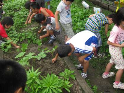 オクラの花壇の雑草を抜いて,自分の鉢のホウセンカのお世話もしました。
