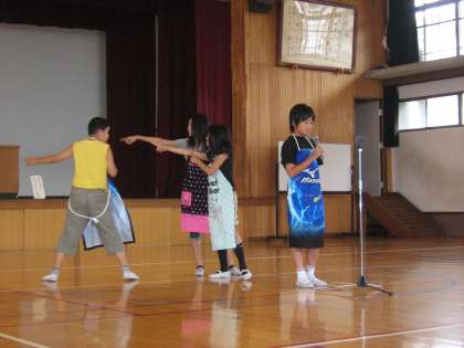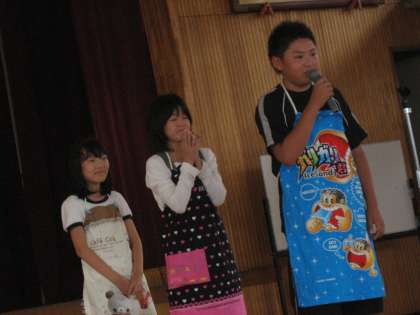 家庭科で作ったエプロンの発表会をしました。みんなエプロン作りの思い出をスピーチし、班でポーズをとりました。