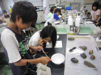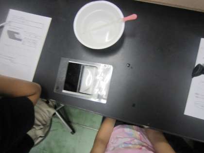分れつしたプラナリアは再生し、2つの個体になるそうです。次はプラナリアの性質「明るいのと暗いのはどっちが好きか?」調べました。プラナリアは暗い方目がけて結構な早さで移動していました。各班のデータを持ち寄り、考察することができました。