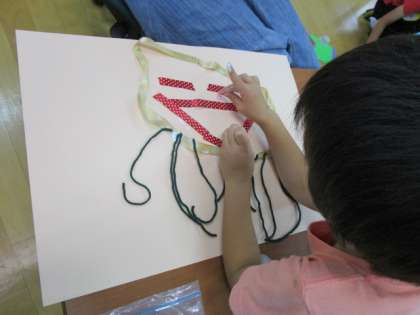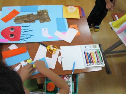 くすのき学級の2年生は,いろいろな材料を使って,ひらめいた海の中の様子を表現しました。くらげやたこ,たい,わかめなどいろいろな海の生き物を個性豊かに表現していました。
