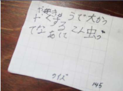 「クイズさがし」とは,前半で,係が教室中に隠した手作りのクイズの紙を探します。