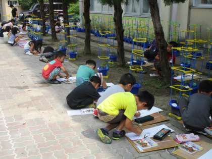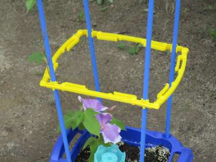 生活科であさがおを育てています。つるが伸び始めた様子を絵に描きました。中には早くも花が咲いているあさがおもありました。自分のあさがおに名前をつけて大事に育てています。