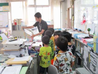 学校のいろいろな部屋をたずねて,教職員に質問をしました。職員室や校長室,給食室,保健室,用務室,図書室など,教室以外の部屋をたずねて,「どんなお仕事をしているのですか。」とか「すきな食べ物は何ですか。」など,いろいろな質問をしていました。