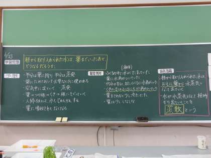 この日は,「取り入れられた水は,葉までいったあとどうなるか。」という学習問題に取り組みました。