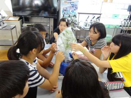 9時から袋をかぶせておいたホウセンカ。2時間後の11時ごろに観察を開始しました。すぐに袋の内側に水滴がたくさんついていることに気付きました。また,茎の近くの袋にも水滴がついていることに気付いた人もいました。
