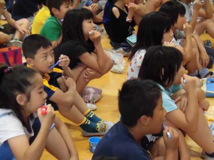 正しい歯の磨き方も教えてもらい,給食のあとに早速歯磨き!