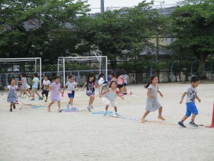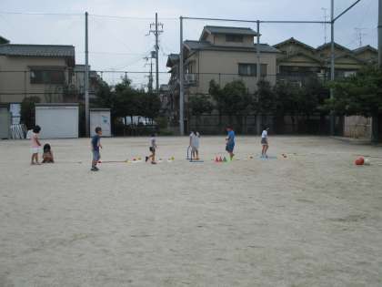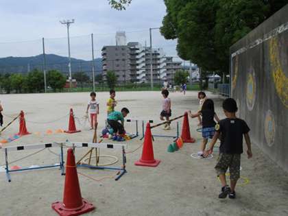 体育倉庫に入っていたいろいろな用具を工夫して並べ,大きな模様を作ったり基地を作ったりしました。最後はできた形や基地の中に入って遊びました。