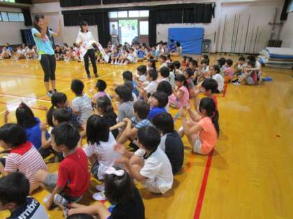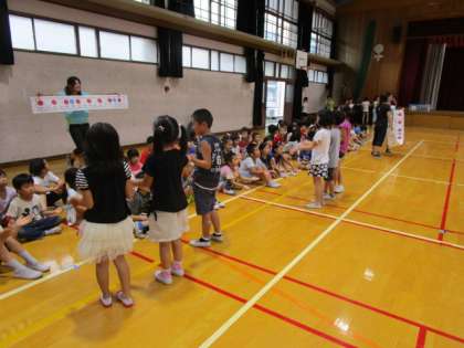 全校音楽のリズムあそびの練習の時,代表の子どもたちが前に出て,お手本を見せてくれました。