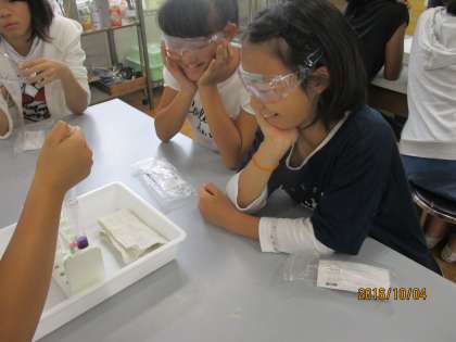 ムラサキキャベツ液を使って、水溶液の性質を調べました。