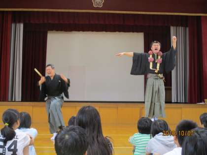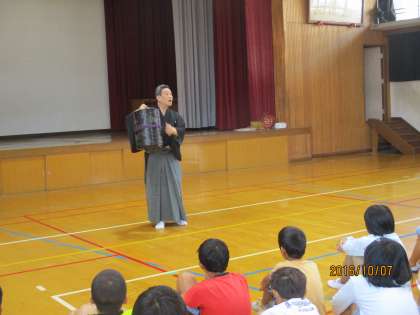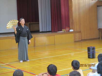まずは国語の教科書に載っている「柿山伏」をみせていただきました。やはり実際にみせていただくと,迫力があって子どもたちは引き込まれるように真剣に見ていました。