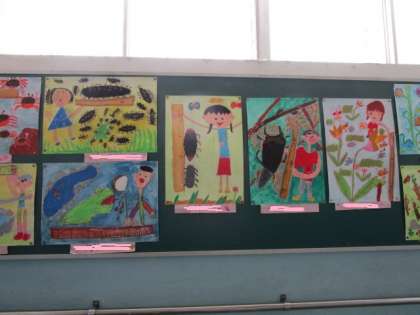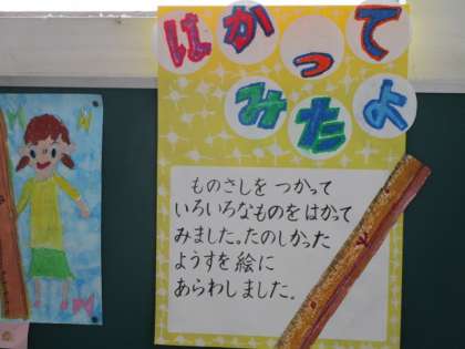 図工の「はかってみたよ」では,定規を使って測ってみたいろいろな様子を絵にあらわしました。