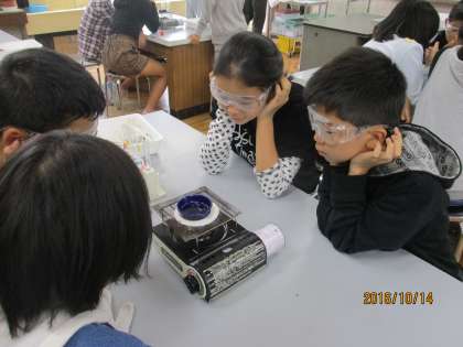 蒸発皿にアルミニウムが溶けた塩酸を入れ,コンロで熱しました。