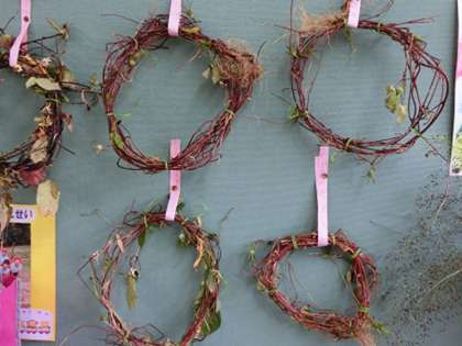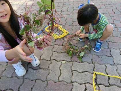 アサガオの花が咲き終わって枯れたので,リースにするためにつるをとりました。長いつるが支柱にくるくる巻きついているので,大変な作業でしたが,友達と協力してなんとかリースの土台ができました。次は飾りつけをします。どんなリースができるのか楽しみですね。