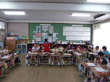 音楽の時間にリズム遊びをしています。3つに分かれてちがうリズムを手で打ったり,それぞれが好きなリズムを選んで全員で打ったりして楽しく活動しています。