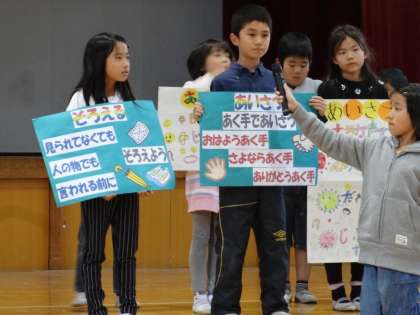 各クラスの後期あいさつ・そろえる目標を発表します。