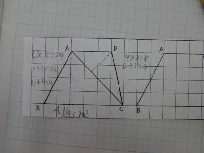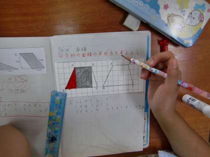 算数では台形の面積の求め方の学習に入りました。三角形と四角形に分割して考える方法,回転させる方法など今まで学習したことを生かして自力解決にのぞんでいました。