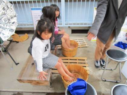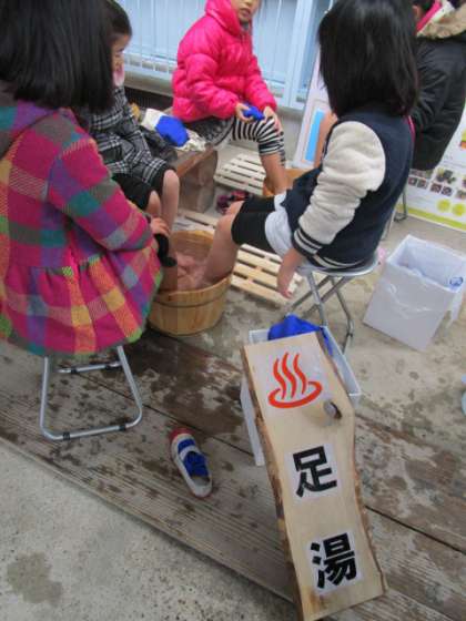イベントのもう一つ「足湯」も行われました。エコ学区サポートセンターの皆様が中心となって,薪で炊いたお湯に冷えた足をつけて気持ちよさそうでした。
