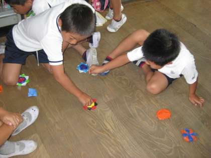 地域の方がつくって下さった折り紙のこまをして遊んでいました。