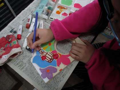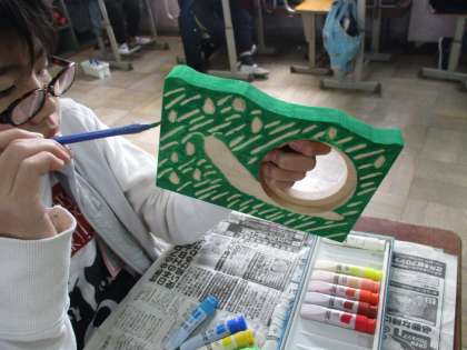 電のこや彫刻刀で形を作り,絵の具で色付けをしていきます。