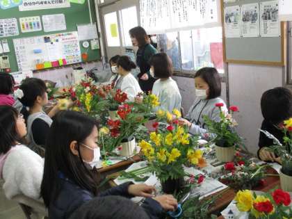 みんな,真剣なまなざしで自分のお花をアレンジしていました。