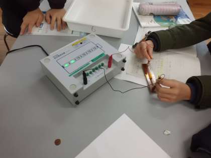今日は,太い電熱線と細い電熱線で発熱のちがいを調べる実験をしました。
