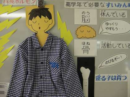 9月の身体計測時に、「すいみん」について話をしました。眠っている間に、骨は伸びようとしています。脳は、1日の活動の後 ゆっくり休ませてあげましょう。