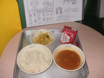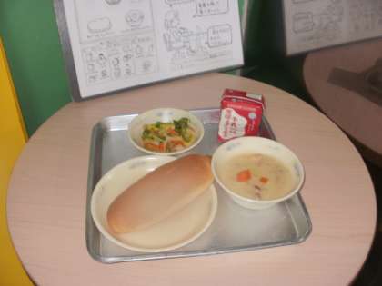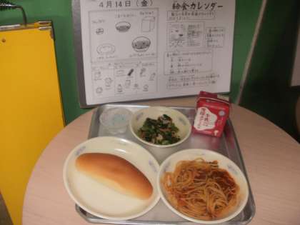 給食がはじまり1週間「スパゲティのミートソース煮」や「じゃがいものクリームシチュー」がありました。