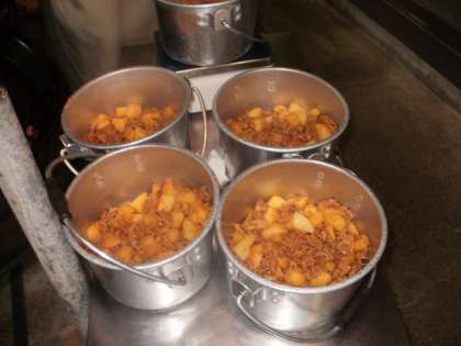 「豚肉のケチャップ煮」は、豚肉を炒めてケチャップで味つけし、蒸したじゃがいもを合わせて仕上げました。