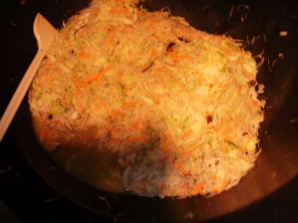 「たっぷり野菜のビーフン」はチキンハム・人参・玉ねぎ・もやし・しいたけを炒めて、チキンスープと塩・こしょう・料理酒・醤油で味つけして、ビーフンを入れて仕上げました。野菜がたくさん入ってボリュームがありました。