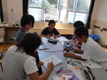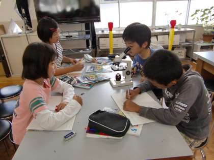 理科では,アサガオの花粉とおしべの様子を顕微鏡で観察しました。みんな上手に絵に表していました。次はめしべを観察する予定です。