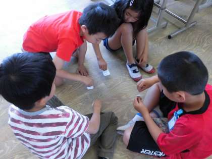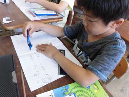 最初にこま作りをして,点の模様がえがく「円」に注目しました。