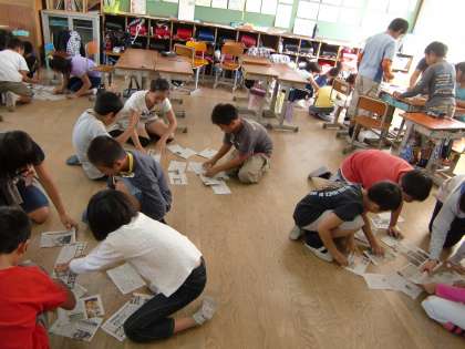 道徳の時間に新聞パズルをしました。他のグループが16分割,32分割した新聞をグループのみんなで協力して元通りにするという活動です。