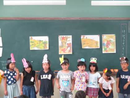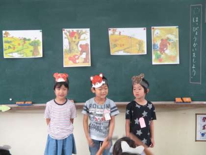 自分の好きな挿絵を選び,その場面の音読発表会をしました。お面をつけて,お気に入りの登場人物になりきって,身体を動かしながら表現していました。