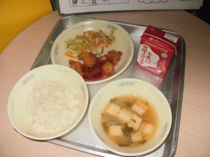 麦ごはん・牛乳・チキンカツ・ソテー・みそ汁