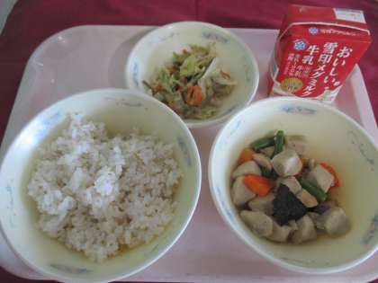 『高野どうふと野菜のたき合わせ』は、しいたけの戻し汁・さとう・しょうゆで、鶏肉・にんじん・しいたけを煮、けずりぶしで取っただし汁・さとう・しょうゆで高野どうふを加えて煮含めて、三度豆を加えて仕上げました。