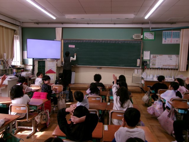 栄養教諭による食に関する指導がありました。子どもたちは、入学してからたくさんの給食を味わってきました。この日は、給食のことがもっと好きになれるように、給食を食べてもっと「にこにこ」になれるように、どんな食べ方をするといいのか考えました。