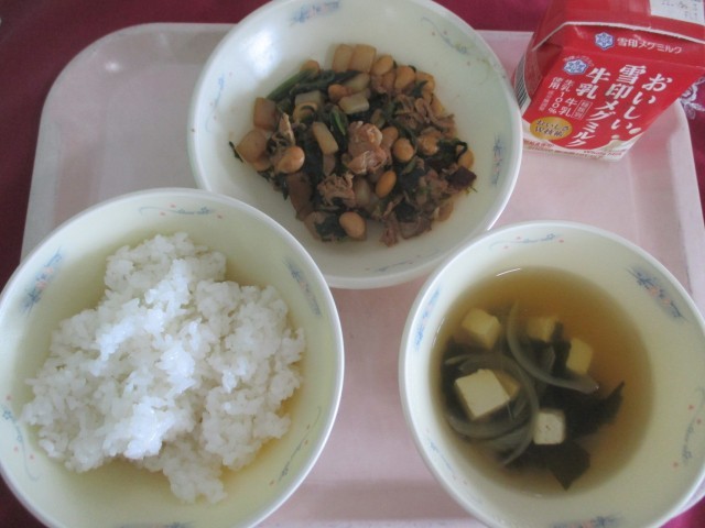 『肉みそいため』は、大豆や豚肉・こんにゃくに絡んだ味噌のコクやうま味を味わって食べました。