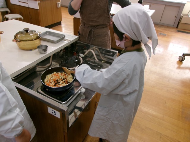 本日、生活単元の学習でおにぎりと混ぜご飯の具を作りました。子どもたちはご飯の炊き方から確認し、ガラス鍋でご飯がたける様子を興味津々で見ていました。混ぜご飯の具を作るにあたって、にんじんや油揚げを慎重にみじん切りにしていました。とても美味しく出来上がりました。