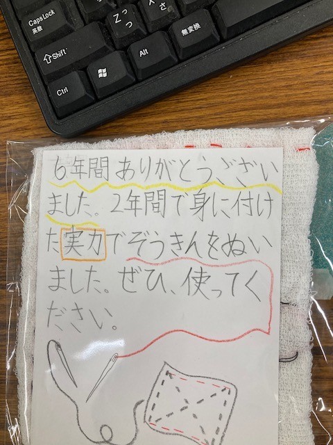 画像のように、メッセージのついた手作りの「ぞうきん」です。