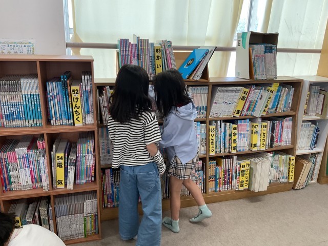 今日は、図書館で図書館オリエンテーションがありました。司書の先生に読み聞かせをしてもらいながら、図書館での本の探し方を学びました。