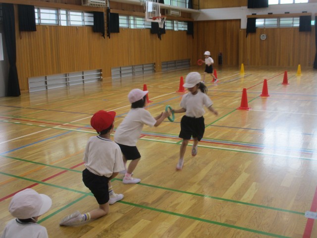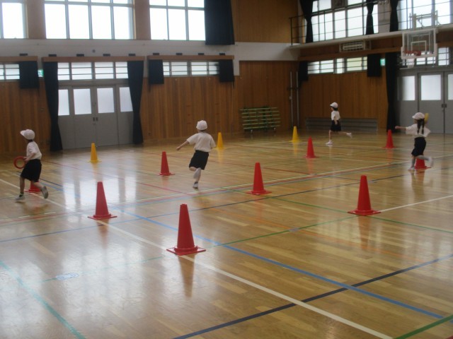 コーンを1周したり、くねくねコースに挑戦したりして、リレー遊びを楽しみました。