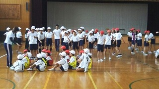リレーの練習の様子です。リレーは,体育館で低学年,高学年別に練習しました。前の走者や次の走者を確認したり,バトンの渡し方の練習をしたりしました。