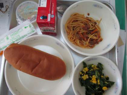 今日から給食も始まりました。今日の献立は,小型コッペパン,牛乳,スパゲティのミートソース煮,ほうれん草のソテー,りんごゼリーでした。子どもたちは新しいクラスで友だちと協力して給食当番の仕事に取り組んでいました。