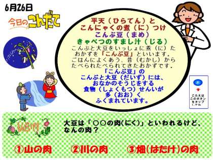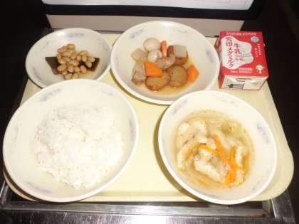 ◆ 今日の献立 ◆ ・ごはん ・牛乳 ・平天とこんにゃくの煮つけ ・こんぶ豆 ・キャベツのすまし汁