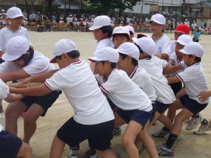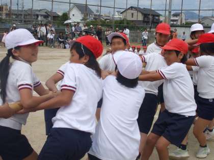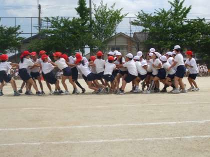 5年生と一緒にした棒引き。知恵を振り絞った作戦と,友達同士で力をだし合った協力の力で,棒を取りました。